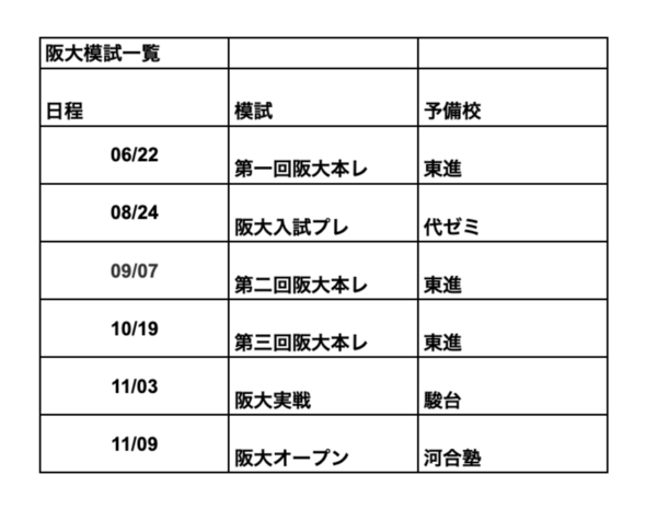 まずは、主要な4大予備校(東進・代ゼミ・駿台・河合塾)が実施している阪大模試のスケジュール感を確認しましょう。